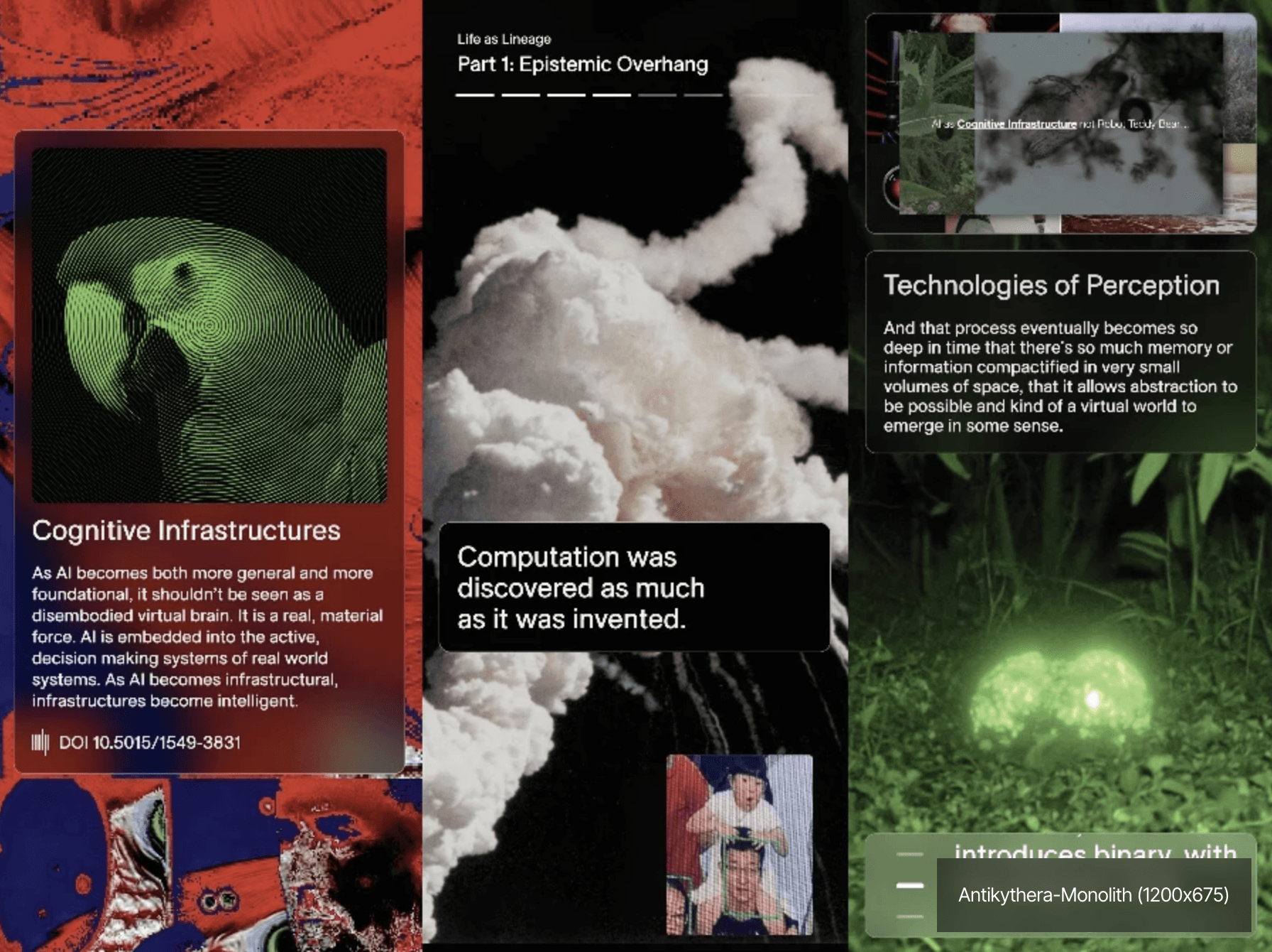 The Noocene features selections from Antikythera’s archive presented as a generative cinematic matrix overlaid with key concepts from the school of thought.